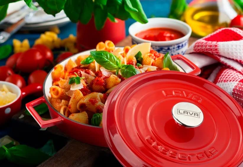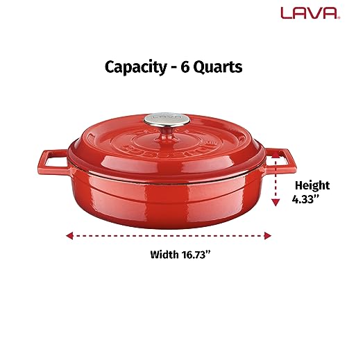 LAVA 6 Quart Enameled Cast Iron Braiser: Multipurpose Stylish Red Round Dutch Oven Pot with Enameled White Interior and Trendy Lid