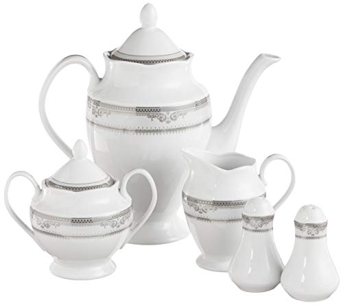Set comes with 8 each of the following: 10.5″ dinner plate, 8.5″ soup bowl, 7.5″ salad plate, 5.5″ fruit bowl, teacup and saucer. serving pieces include 1-14″ oval platter, 1-9″ serving bowl, 1-teapot, 1-creamer, 1-sugarbowl, and 1-salt and pepper set