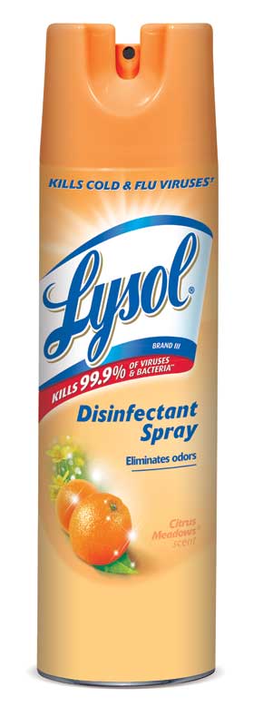 LYSOL Disinfectant Spray CITRUS MEADOWS is an easy, convenient way to freshen your home while helping prevent the spread of germs to help protect your family. This spray eliminates odors and kills 99.9 percent of viruses and bacteria on most household surfaces. LYSOL Disinfectant Spray also helps control and prevent mold and mildew. And to make your home smell more inviting, LYSOL Disinfectant Spray has a fresh, clean scent of juicy oranges and lemons.