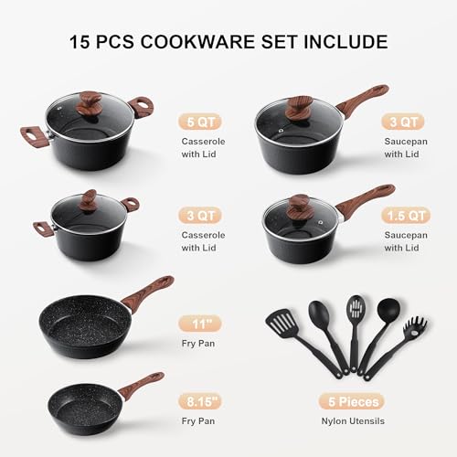 Specification: MAISON ARTS Pots and Pans Set Non Stick, 15 Pcs Non Toxic Hammered Cookware Set, Black Granite Induction Kitchen Cooking Sets