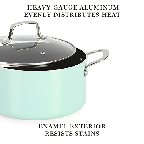 A beautifully-crafted collection of pots and pans, the Martha Stewart Lockton 10-piece Enameled Aluminum Nonstick Cookware Set is a lovely suite to add to any home cook’s current cookware collection or to give to amateur home chefs who are keen to hone their craft. Constructed from heavy-gauge aluminum, each pot and pan heats and cooks evenly to serve up new recipes and signature dishes. Made without PFOA, the interior features a triple-layer Platinum SR nonstick coating to promote smooth food release and easy cleanup. Mix, flip, scoop, and serve with confidence using the sturdy, riveted handles. They provide balance and support when lifting and transferring from the stove to the oven, or when serving from oven to table. This picture-perfect collection is built for style and function and suitable to use on gas, electric, ceramic, and halogen stovetops. The four aluminum pots come with corresponding lids- all made from tempered glass with vents to prevent boil-overs while helping monitor cooking progress without constantly lifting and checking. For recipes that require baking or just a few minutes in the oven, these pieces are oven safe up to 480°F. Dishwasher safe, hand wash recommended.