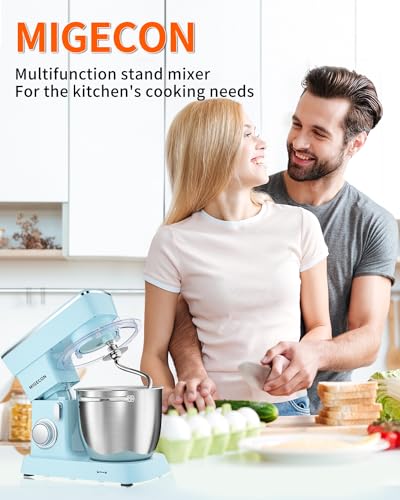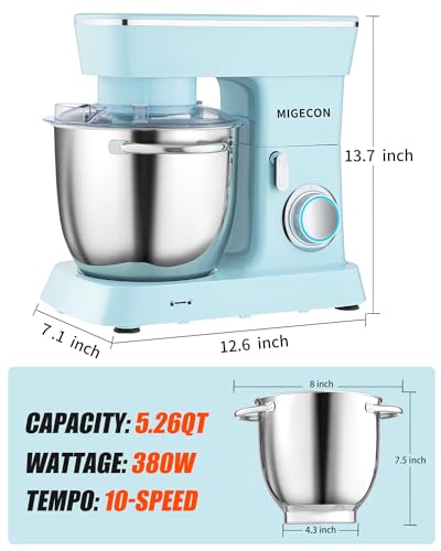 Specification: MIGECON Stand Mixer,Electric Food Mixer, Dough Hook, Flat Beater Attachments, Splash Guard 10 Speeds with Whisk, 5.26 QT Blue