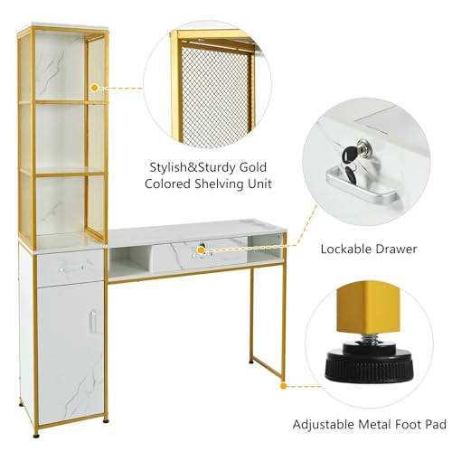 Modern and Stylish Design: Featuring golden metal iron pipe and mesh accents along with a sleek marble wooden board structure, this salon station boasts a modern design suitable for various salon or living room settings