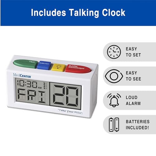 TALKING ALARM CLOCK: Alerts users it’s time to take their medication along with the time and date using a repeating friendly female voice reminder up to 4 times daily (Morning, Afternoon, Evening, Night). “Good morning! Please take your MORNING pills for the 20th.” Press the “Alarm Acknowledged Button” to confirm compliance and the talking clock tells you when the next daily dose is due.