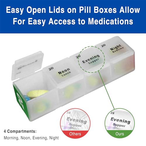 30 DAY PILL ORGANIZER: 31 days of pill boxes made for those who take medication at multiple times each day. Daily pill boxes have four compartments (morning, noon, night, evening) that hold up to 64 pills each day. Month long pill organizer keeps all medications and vitamins needed daily safe and organized.