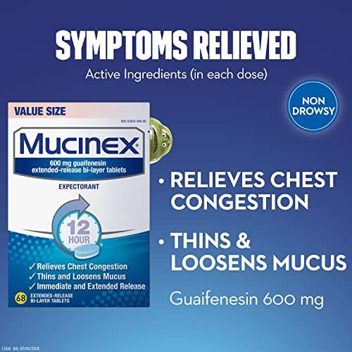 Mucinex Extended-release Bi-layer tablets provide powerful symptom relief. The product relieves chest congestion, thins and loosens mucus and lasts for 12 hours. It contains a unique bi-layer tablet – one layer for immediate release and one layer for extended release, so the medicine starts to release right away and lasts for up to 12 hours, so you can say goodbye to retaking medicine every 4 hours. Mucinex is the #1 Cold and Cough brand doctors trust for themselves and their families* and the #1 Pharmacist Recommended Brand as well. This product contains 120 tablets. It can be used by Adults and Children 12 years of age and over. KEY SYMPTOMS RELIEVED: Mucinex Extended-release Bi-layer tablets relieve chest congestion and thin and loosen mucus ACTIVE INGREDIENT: Contains Guaifenesin which is an expectorant that relieves chest congestion and thins & loosens mucus making cough more productive Use as directed *IQVIA using ProVoice Survey, August 2020 U.S. News & World Report/Pharmacy Times 2020-2028