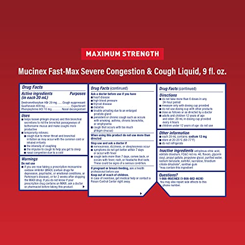 Specification: Mucinex Fast-Max Severe Congestion & Cough Multi-symptom Max. Strength Liquid- Expectorant, Cough Suppressant, & Nasal Decongestant, w/Dextromethorphan, Phenylephrine & Guaifenesin, 9 oz. (Pack of 4)