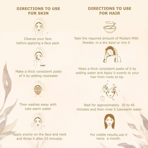 HOW TO USE – (For Face) take 2 tablespoon of Kimayra World Organic Multani Mitti Powder in a bowl. Add some water or few drops of rose water to make a thick spreadable paste. Keep it for 15-20 minutes. Apply it on the face and neck. Once it is dry, splash some water and gently massage in a circular motion. Wash your face with normal water and pat it dry. Apply moisturizer for deep nourishment.