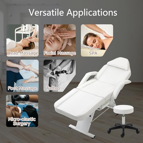 Specification: Multipurpose 3-Section Facial Table, Massage Salon Tattoo Chair with Two Trays and Hydraulic Stool, Esthetician Bed, Adjustable Barber Spa Beauty Equipment, 72.8″ L x24.4 W x 27.6″ H, White