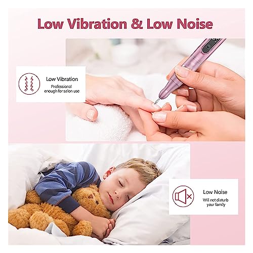 Low Noise Low Vibration The updated acrylic nail drill kit uses the newest motor It maintains low noise and low vibration under the presumption of guaranteeing a fast rotation speed. The noise level is less than 25dB. You will get a relaxing manicure and pedicure experience with its low voice and gentle vibration.