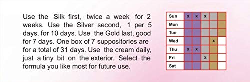 Warning: Product becomes soft when weather is hot. Refrigerate before use. Start with the mild Silk formula (2/week). Then, change to the moderate Silver formula (1/5 days) and the strong Gold formula (1/week).