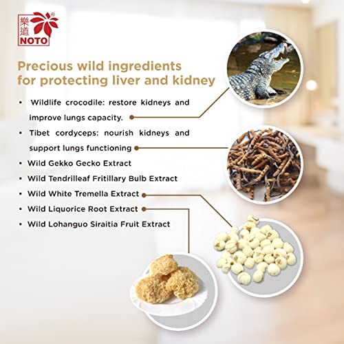 Protect Lungs and Kidneys – NOTO Perfect lung capsule consists precious wildlife crocodile meat with cordyceps from Tibet, clams, fritillary bulb, licorice and monk fruit, etc. Crocodile meat and cordyceps effectively nourishes kidney Qi, removes dampness and toxins, promotes lungs and kidneys health, clears sputum and stops asthma. Ingredients of Noto Perfect lung capsule work together to effectively stop coughing, remove sputum.
