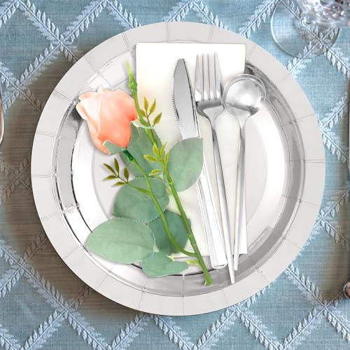 Suitable Size: these disposable silver charger plates measuring about 13 inch, fit under salad plates, soup bowls and main course dinner plates and are designed with wide rims to prevent spills from soiling your tablecloth