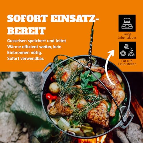 Use in your kitchen or outdoors with an open fire or briquettes. You can even place embers or charcoal on the lid. Suitable for soups and stews, meat dishes, casseroles and even cakes!