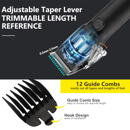 【Full-Size Professional Hair Clippers】: The adjustable taper lever(0.5-3.5mm) of the hair clippers works with the 12 guide combs(1.5-25mm) to allow custom cutting lengths to meet the trimming needs of different lengths of hair which. achieve smooth hair trimming, can help you cut a clean and neat fade. designed to create seamless blends while hard or soft line fading, for thick and wet hair, no pulling, no sticking, and a more comfortable cutting experience.