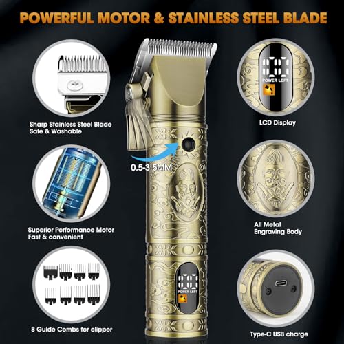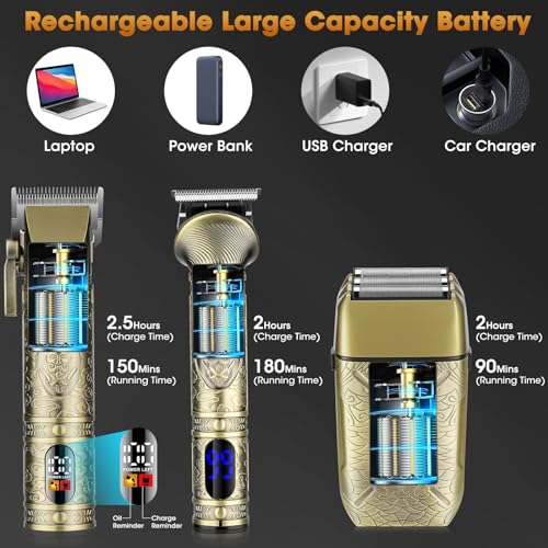 [LED Displays & Large Capacity Battery] – The men’s hair clippers set is built-in LED display. you can check the remaining power and battery status, and be reminded to drop blade oil in time. Hair clipper features a rechargeable high-capacity Li-Ion battery that charges for 2.5 hours and provides up to 150 minutes of cordless runtime. USB charging port, you can connect USB adapter, laptop, car charger.