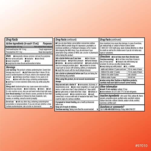 Non-Drowsy DayTime Cold & Flu liquid temporarily relieves common cold/flu symptoms such as: nasal congestion . sinus congestion and pressure . cough due to minor throat and bronchial irritation . minor aches and pains . headache . fever . reduces swelling of nasal passages . temporarily restores freer breathing through the nose . sore throat . helps loosen phlegm (mucus) and thin bronchial secretions to rid the bronchial passageways of bothersome mucus and make coughs more productive