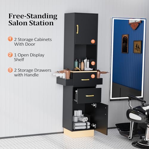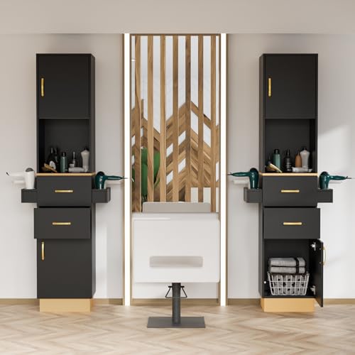 Specification: Salon Storage Station, Barber Stations Beauty Salon Spa Equipment with 2 Drawers, 2 Storage Cabinet, 6 Hair Dryer Holders for Hair Styling, Black Gold
