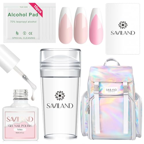🎈Saviland French Nail Stamper: This French nail art kit includes nail stamper, white gel nail polish, scraper, and cleaning pads. Easily create French manicures and various nail art styles.