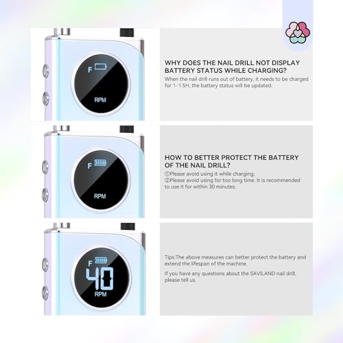 ⭕【Powerful Performance At 40000 RPM】Equipped with robust bearings, Saviland nail drill for acrylic nails operates smoothly at high speeds with adjustable settings. Even at maximum speed, it remains cool, ensuring minimal noise and vibration during operation. Get the job done efficiently without the distractions.
