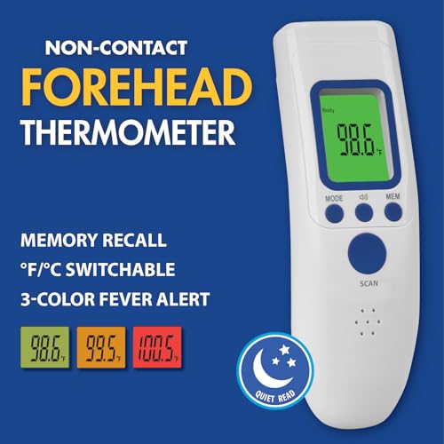 NON-CONTACT THERMOMETER—Non-invasive touch-free forehead measurements; body, object and room options; tri-color fever alert for instant feedback