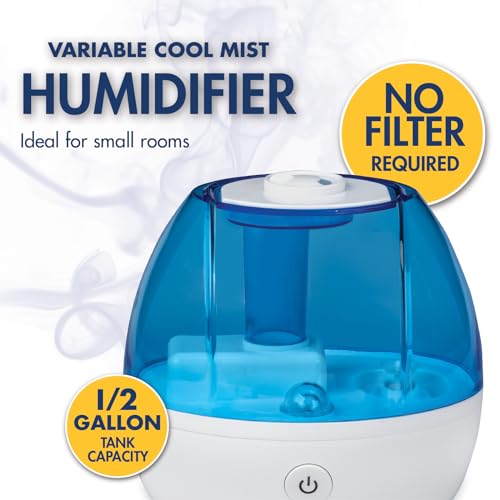 COOL MIST HUMIDIFIER—Small room humidifier offers up to 16-hours of cool mist relief; 2 mist settings, half gallon tank capacity, nightlight, auto shut-off. Best of all, no filters required!