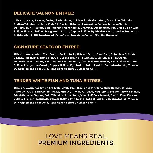 Variety pack contains three delectably soft cat food entrées with the light texture and irresistible seafood flavor cats love