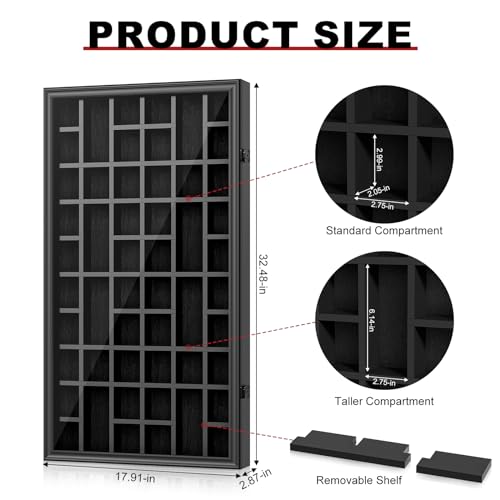 [Fits Various Sizes of Shot Glasses] The shot glass display case with removable shelf, flexible combination of standard and taller compartments. Shot Glass Cabinet: 17.91″W × 32.48″H × 2.87″D, Standard Compartment: 2.75″W × 2.99″H × 2.05″D, Taller Compartment: 2.75″W × 6.14″H × 2.05″D.