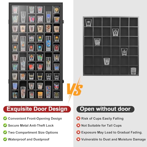 Specification: Shot Glass Display Case, 52 Slots Shot Glass Holder Lockable Wall Mounted Shadow Box with UV Protection Acrylic Glass Shot Glass Door Storage Case for Multiple Shot Glasses