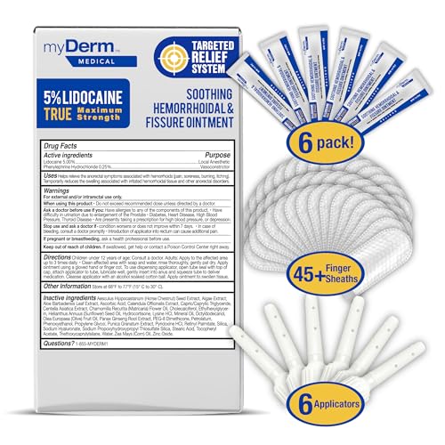 WHERE INNOVATION MEETS VALUE. Here at myDerm, we want to provide you and your loved ones with the most innovative first aid, and skincare to support you in your self-care journey. We manufacture our products ourselves. This allows us to be as close as possible to the final product coming to YOU! MAXIMUM STRENGTH, FAST RELIEF SUPPORT Get your life back with myDerm MEDICAL Hemorrhoidal Ointment! Apply 3 times daily to swiftly soothe away the, itchiness, and burning caused by hemorrhoids and fissures. PROUDLY MADE IN THE USA FDA Registration No. 3018228681. Maximum Strength, Paraben-Free for Faster Relief! SWIFTLY SOOTHES ITCHING, BURNING & SWELLING myDerm MEDICAL Hemorrhoidal Ointment goes to work quickly with 5% lidocaine, the highest strength you can get without a prescription. It also has Phenylephrine Hydrochloride (0.25%) to help reduce swelling. ABSORBS AND ACTS FAST Oral pain meds must be ingested and need to pass through your circulatory system. In addition, myDerm MEDICAL Hemorrhoidal Ointment is applied directly to the affected body part so the active ingredients can get straight to work. You will feel the improvement almost instantly! HOW TO USE CLEANSE the area with soap and warm water. Gently blot dry. APPLY directly over the swollen area using our custom finger sheath, or dispensing applicator. RE-APPLY especially at night and after each bowel movement. FOR BEST RESULTS: Apply myDerm MEDICAL Hemorrhoidal Ointment regularly. Eat high-fiber foods. Drink plenty of fluids. Exercise regularly. Take sitz baths. If the condition does not improve in 7 days, stop use and consult your doctor.