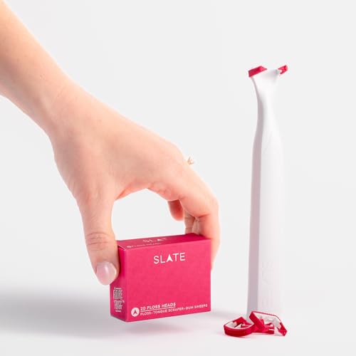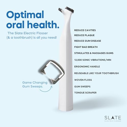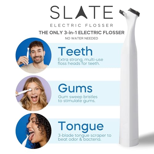 The Slate Electric Flosser is a revolutionary 3-in-1 auto flosser that not only flosses your teeth but also stimulates your gums and cleans your tongue for a complete oral care experience. Endorsed and created by dental professionals, the Slate Flosser has disrupted the flossing industry with its effective, eco-friendly, and user-friendly design, making flossing an easy and enjoyable habit while reducing the risk of cavities and gum disease. The Starter Kit Box includes an Electric Flosser, five Slate Floss Heads, and two AA batteries to get you started. It’s a reusable flosser, reusable tongue scraper, and reusable gum cleaner. Our Woven Floss boasts 450 strands and is free of wax, toxins, and Teflon (no PFAs or PTFE) for a safe and healthy flossing experience. Our electric flosser for adults is the ideal dental assistant, making it a must have addition to your oral care arsenal. It’s also makes a great travel flosser / travel tongue scraper! It’s a cordless flosser making your life easier. You don’t need to carry your big portable water flosser any more! Our flosser provides a thorough and efficient cleaning that can’t always be achieved with manual flossing alone. It can be used as a gum dental stimulator, or gum massager, gum stimulator tool. Our patented gum sweeps are a massager for your gums keeping them healthy and happy! The tongue brush is a great tongue cleaner for adults, tongue scraper for kids, or for anyone! It’s the ultimate floss machine or floss tool for electric flossing. It’s a portable power floss machine. Endorsed and created by dental professionals, and is known as and dental assistant must haves! The ultimate battery tooth flosser, portable tongue scraper, gum flosser, and tongue cleaner kit. This mechanical flosser is about to be the game changer you’ve been looking for all your life.