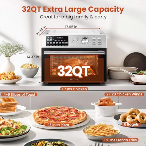 【32QT Extra Large Capacity & 6 Accessories】XL Stainless Steel Air Fryer serves 6-8 people、bake a 13-inch pizza、rotisserie a 7.7lbs chicken、Toaste 6-9 slices bread and dehydrate 4 layers fruits.Includes food-Safe grade 6 essential accessories to cater to all your cooking needs.
