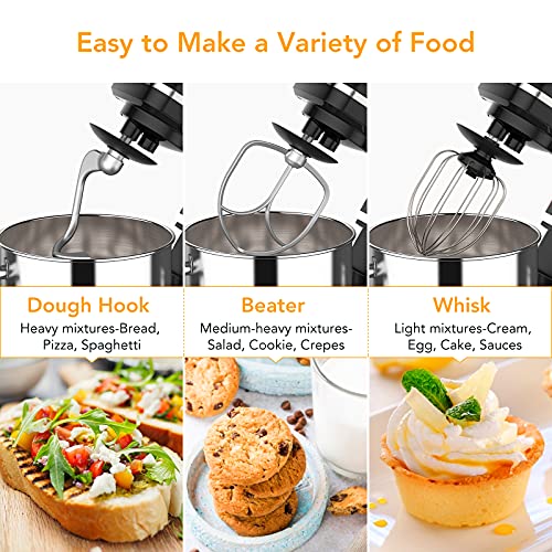 TILT-HEAD & ANTI-SLIP DESIGN: The tilt-head food mixer allows easy access to install or uninstall bowl and accessories. 6 Anti-slip silicone suction cups and solid connecting rod design can reduce vibration and noise, keep the machine steady in place while working. Tips: when you lift up the top half of the stand mixer it will stop working to ensure your safety during the kneading process