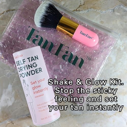 Tan Fan Self Tan Sleep Sac for Dark Tanner + Self Tan Drying Powder Kit – Keep Sheets Clean in 100% Cool Silky Poly + Stop Sticky Sunless Tanner Feeling – 100% Vegan Talc-Free Natural Blend w Brush