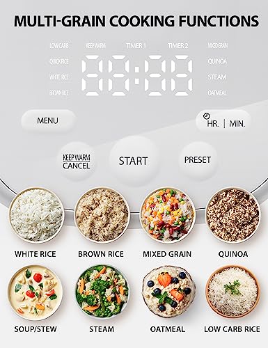 Multi-Function – This large rice cooker has 8 cooking functions: Low Carb, Quick Rice, White Rice, Brown Rice, Mixed Grain, Quinoa, Steam and Oatmeal. It cooks a variety of dishes including white rice, brown rice, sushi rice, mixed rice, quinoa, oatmeal, soup, stew, chili, sauté/simmer, and slow cook. It also steams vegetables, seafood, and more. Whether you’re a beginner or a seasoned chef, this rice cooker with steamer basket offers great versatility