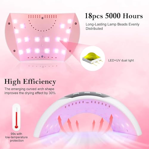 Efficient Power: The 54w nail dryer will reduce your drying time. And the nail lamp has 18 beads evenly distributed to fully cure all the nail glue without a dead zone.