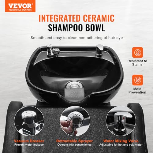 Enhance Your Salon Experience: Elevate your salon with VEVOR high-quality shampoo backwash chair. It features a smooth ceramic basin, easy to clean and resistant to hair dye stains. Enjoy added convenience with retractable sprayer, hot and cold water mixing valve, and vacuum breaker to prevent water leakage.