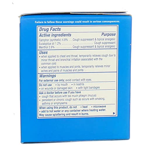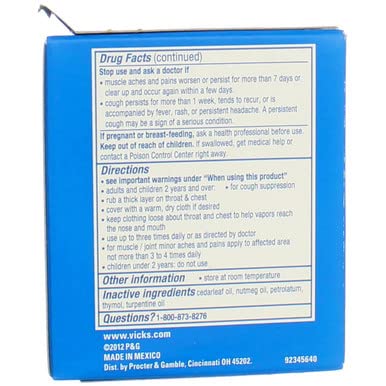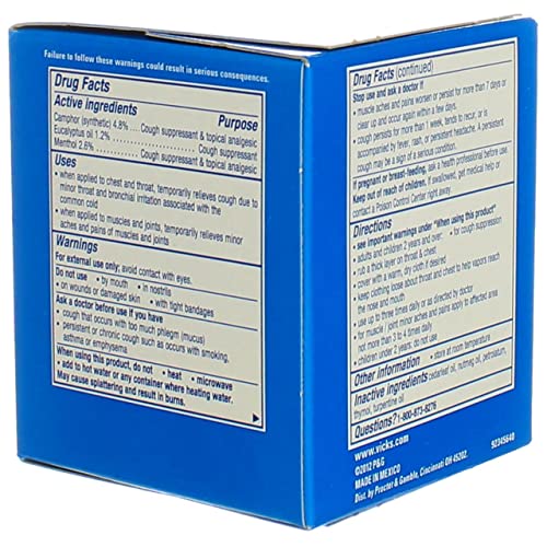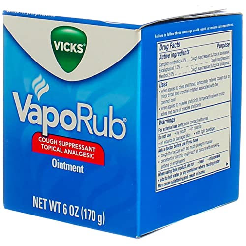 Vicks VapoRub topical cough suppressant is brought to you by the world’s #1 selling OTC cough and cold brand*! Vicks VapoRub is a topical cough over-the-counter medicine with powerful Vicks vapors. It works quickly to relieve coughs so you can breathe easier. Vicks VapoRub is specially formulated with three active cough suppressants: menthol, camphor, and eucalyptus oil. To use, rub a thick layer of the medicated ointment on your chest and throat to temporarily relieve cough due to minor throat and bronchial irritation associated with the common cold. Keep clothing loose around throat and chest to allow the Vicks Vapors to reach the nose and mouth and go straight to the source of your cough. Use up to three times daily or as directed by a doctor for soothing and comforting relief. VapoRub can also be used as a topical analgesic to temporarily relieve minor aches and pains in your muscles and joints. To use for muscle and joint aches and pains: apply to affected area not more than three to four times daily.*Nicolas Hall’s global OTC sales database, DB6.