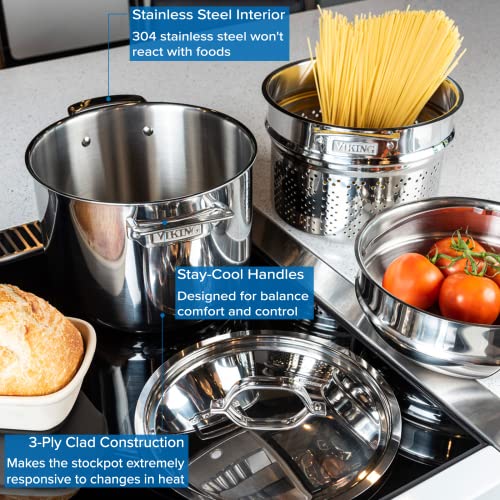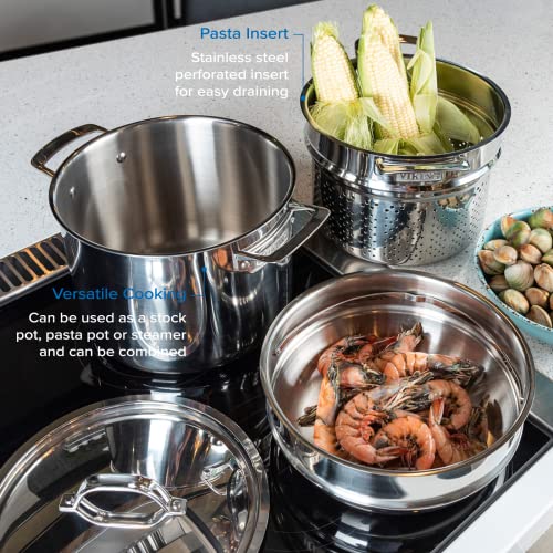 Viking Culinary 3-Ply Stainless Steel Pasta Pot, 8 Quart, Includes Pasta & Steamer Insert, Dishwasher, Oven Safe, Works on All Cooktops including Induction