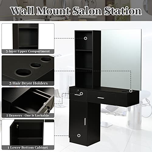 Wall Mount Salon Station with Mirror, Beauty Salon Barber Spa Equipment with Mirror, Shelves, Cabinet, Locking Drawers, Table, Standing Hair Styling Furniture, Black