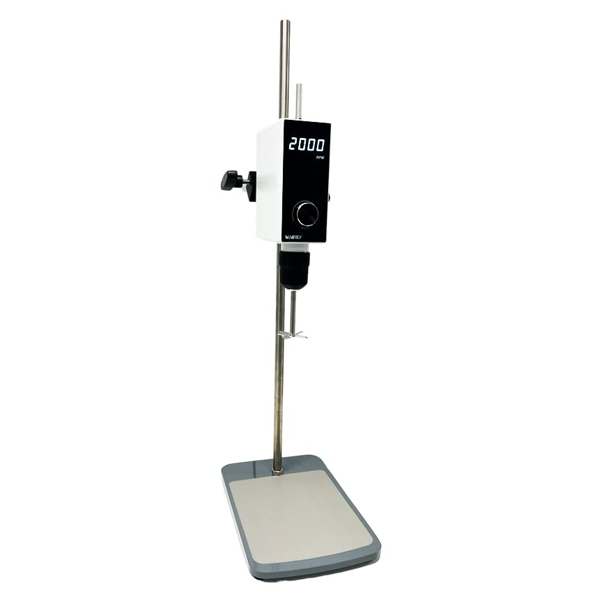 The new overhead digital stirrer mixer from Waverly Scientific products is a universal overhead stirrer ideal for many different applications. Perfect for stirring, mixing, homogenizing liquids/solids including low to high viscosity substances. Waverly has designed this stirrer for the modern laboratory. It is compact, lightweight and has a sleek design. Featuring a sharp LED digital display covered by tempered glass cover (like an iPhone). ST1R features a through-shaft design that allows you to adjust shaft length to suit your application. Also provides an easy and fast way to change out vessels between batches. We offer several stir shaft options in both stainless steel and PTFE including crossed stirrer, straight stirrer, centrifugal stirrer, anchor stirrer, dissolver stirrer, paddle stirrer and propeller stirrer. What’s Included: ST1R Overhead Stirrer Mixer, universal stand with mounting hardware, crossed stirrer shaft, power cord, operation manual Specifications: Motor Type: premium maintenance-free brushless DC motor Electrical: 100-240V, 50/60 Hz Power: 145W Speed range [under nominal load]: 0/50-2000 rpm Speed increment: Stepless, 10 rpm Speed accuracy: ±1rpm Max Torque [at stirrer shaft]: 40 N.cm Max Viscosity: 50,000 mPas Speed display: LED Protection class [according to DIN EN 60529: IP 42 Overload/Motor/Temperature Protections: Yes Chuck range diameter: 0.5-10mm Permissible ambient temperature & humidity: 5-40C, 80% Dimensions [W × H × D]: 2.8 x 6.8 x 9.5in (71 × 174 ×240mm) Weight: 5.5 lbs.