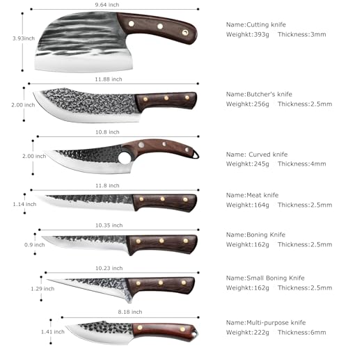【PERFECT SET COMBINATION】 Set includes a 9.64″cutting knife, an 11.88″butcher’s knife, a 10.8″curved knife, an 11.8″meat knife, a 10.35″boning knife, a 10.23″small boning knife, an 8.18″multi-purpose knife, and sharpening rod. Get ready to tackle any culinary challenge with this comprehensive 8-piece butcher knife set!